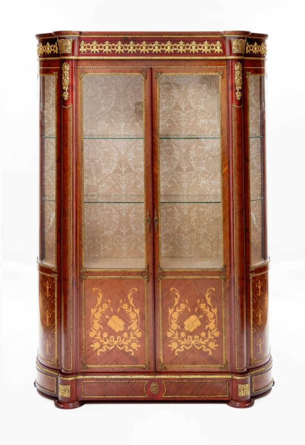 Vitrina en madera de caoba y marquetería con decoración de flores, partituras e instrumentos musicales. Remates y molduras en bronce dorado con decoración vegetal. Estilo Luis XVI.