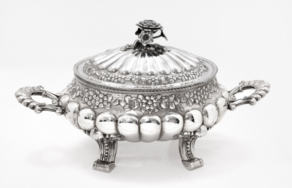 Sopera en plata galloneada con decoración de flores, tapa con remate de flores y rosas. Estilo Luis XVI. Marcas de platero.