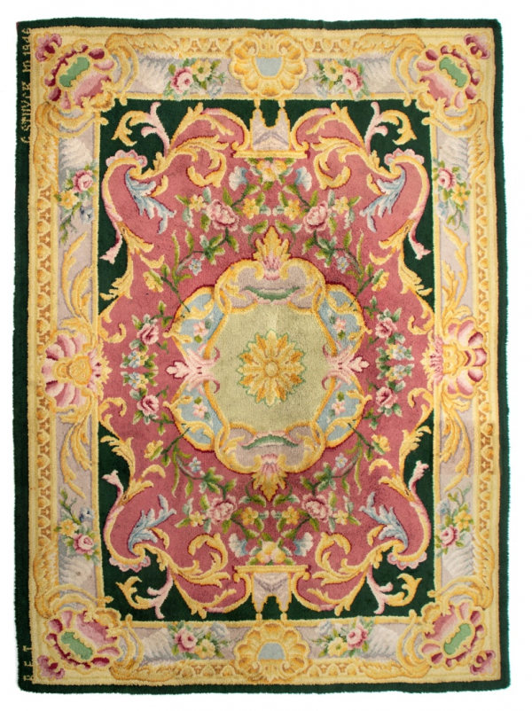 Alfombra de lana de La Real Fábrica de Tapices con decoración de medallón central con decoración de flores y greca alrededor con flores y guirnaldas en tonos verdes, rosas y amarillos etc. Firmada G. Stuyck 1946.