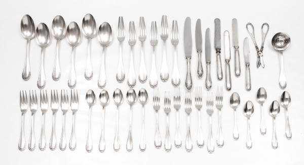 Cubertería en plata con decoración de flores y hojas compuesta por 45 piezas: 6 cucharas de mesa, 7 tenedores de mesa, 6 tenedores de pescado, 7 tenedores de cadete, 5 cucharas de postre, 5 cucharillas de palo largo, 1 cazo, 1 tijera de uvas y 7 cuchillos. Estilo Luis XVI. Marcas de platero.