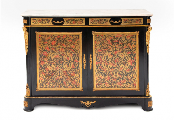 Cómoda en madera lacada en negro, pintada imitando a carey e incrustaciones de metal con decoración vegetal y bronces dorados representando esfinges, greca y lazos en bronce, con 2 cajones superiores, puertas inferiores y balda interior. Encimera de mármol, Estilo Bull.
