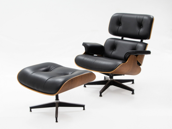 Butaca giratoria y escabel en madera de nogal forrado en semipiel negra.