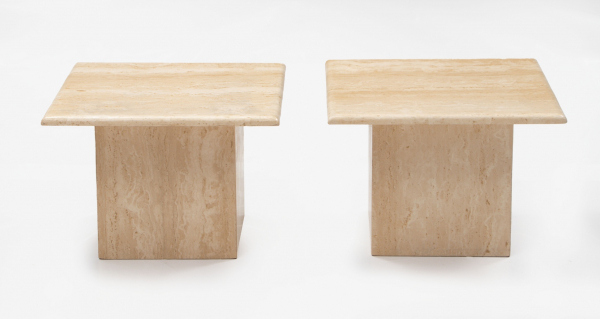 Pareja de mesas de centro cuadradas en mármol travertino.
