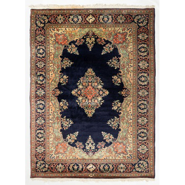 Alfombra de lana con decoración vegetal y flores en tonos azules, verdes, calderas, etc.