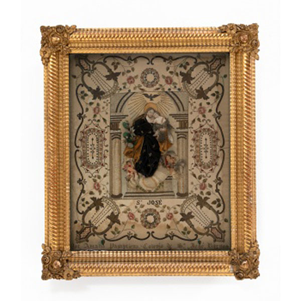 Tapiz en seda bordada con hilo de oro y diferentes telas representando San José con el Niño. Inscripción Colegio San José. Burgos Marco en madera y estuco dorado con decoración vegetal y flores. Estilo Luis XVI.