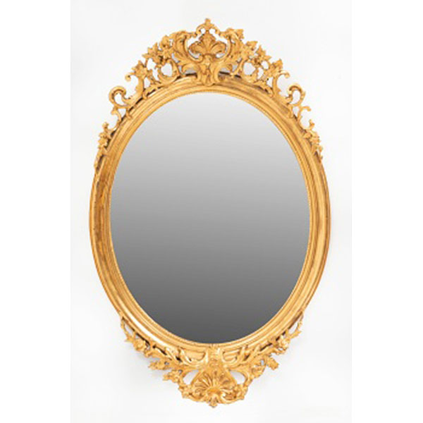 Espejo en madera y estuco dorado con decoración vegetal, flores y 2 copetes centrales con rocallas y perlas alrededor. Estilo Luis XVI.