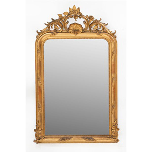 Espejo en madera y estuco dorado con decoración vegetal, flores y copete central. Estilo Luis XVI.