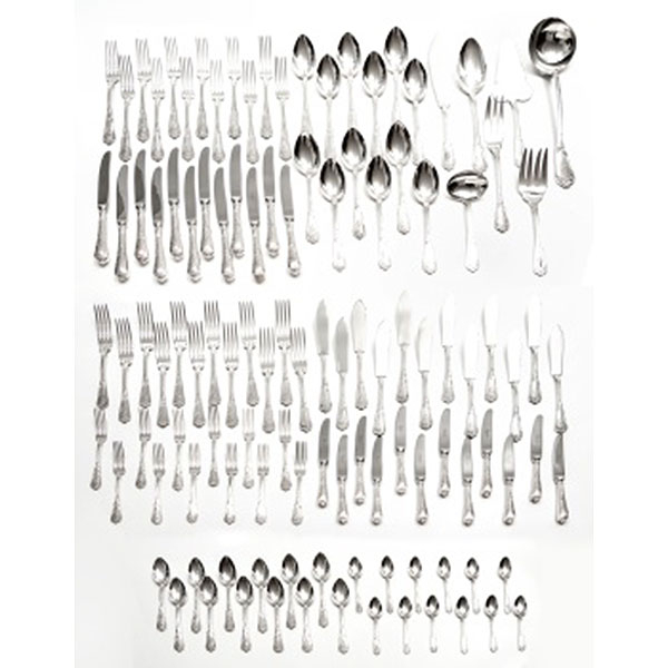 12 cucharas, 12 tenedores y 12 cuchillos de mesa, 12 tenedores y 12 palas de pescado, 12 cucharas,12 tenedores y 12 cuchillos de postre, 12 cucharillas de café, 7 piezas de servir (cazo, tenedor y cuchillo de trinchar, cucharón y tenedor de servir, cazo de salsa y pala para tarta).