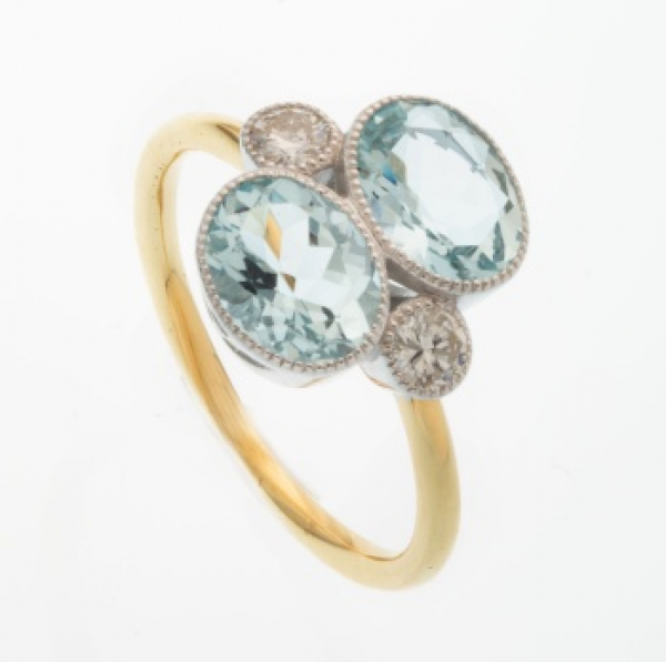 Sortija estilo Art Decó en oro amarillo y oro blanco con 2 aguamarinas de un peso total de 2,20 cts. aprox y 2 diamantes talla brillante