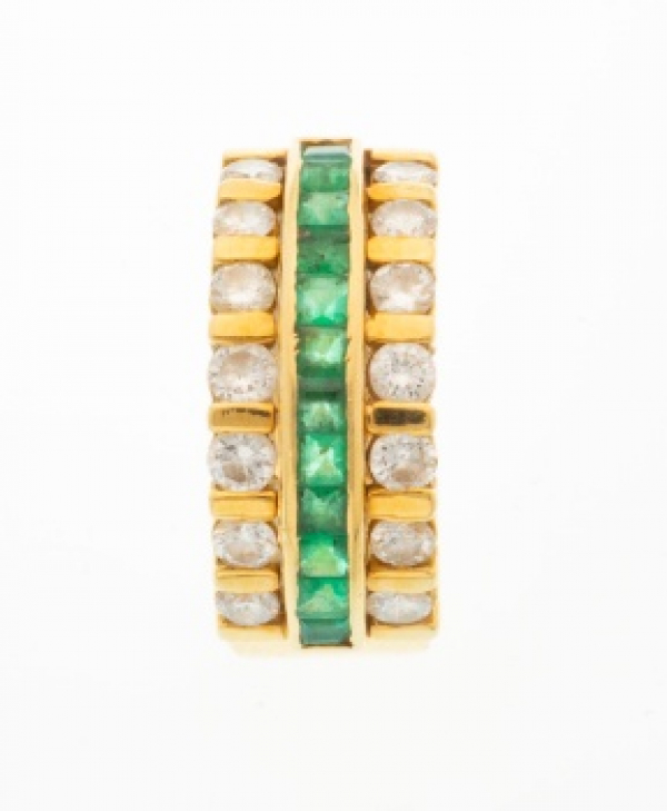 Sortija en oro amarillo con fila de esmeraldas talla baguette y 2 filas de diamantes talla brillante