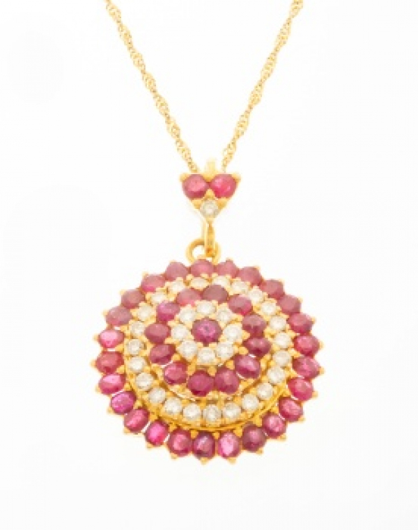Cadena y colgante en oro amarillo de 14 kts. con 2 orlas formadas por 41 rubíes y 2 orlas formadas por 35 diamantes talla brillante