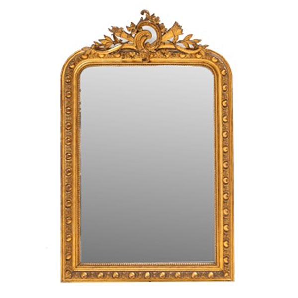 Espejo en madera y estuco dorado con decoración vegetal, perlas y copete central representando antorchas y flores. Luna original. Estilo Luis XVI. Época Napoleón III. Francia.
