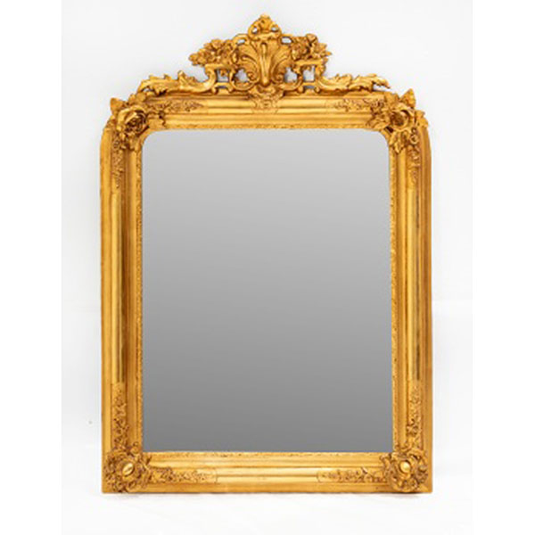 Espejo en madera y estuco dorado con decoración vegetal, flores, rocallas, copete central representando flores y rocalla. Luna original. Estilo Luis XVI. Época Napoleón III. Francia.