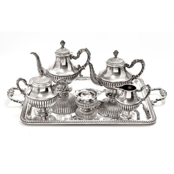 Juego de café y bandeja en plata con decoración vegetal y gallones compuesto por: cafetera. tetera., lechera, azucarero y colador. Estilo Luis XVI. Con marcas de platero Cruz de Malta.