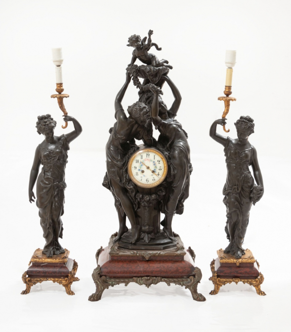 Reloj y pareja de candelabros en calamina patinada con figura representando damas portando candelero dorado con decoración de flores. Estilo Luis XVI. Época Napoleón III. Francia.