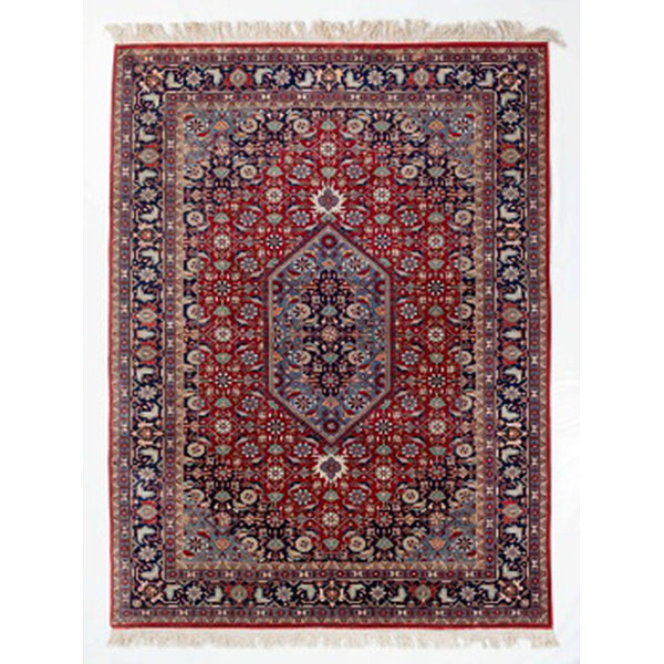 Alfombra de lana con medallón central y greca alrededor con decoración geométrica y vegetal en tonos granates, azules y beiges.
