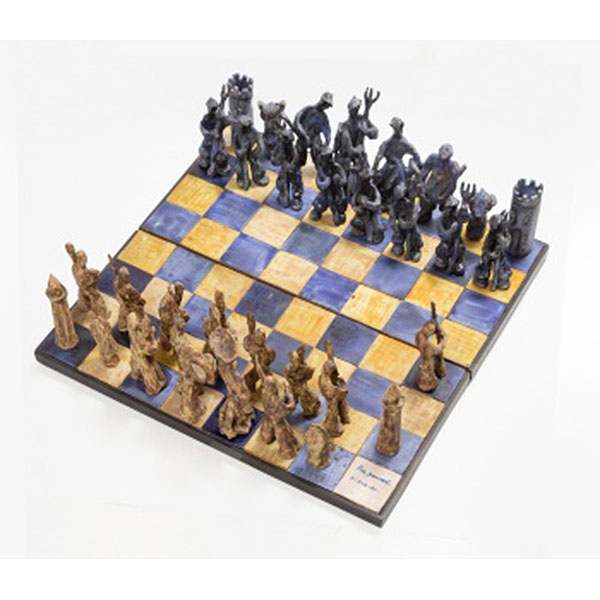 Cerámica esmaltada 80 x 80 cm. (tablero) ; 15 x 7 x 5 cm. (layador) ; 16,5 x 10 x 4 cm. (arrantzal) ; 10 x 7 x 5 cm. (cabeza de toro) ; 16 x 14 x 6 cm. (aldeana con cesta) ; 11,5 x 5,5 x 5 cm. (castillo)Tablero y ajedrez en cerámica policromada azul y beige con fichas representando personajes vascos : layadores, arrantzales, aldeana con cesta, bogadores, cabeza de toro, castillos, etc.