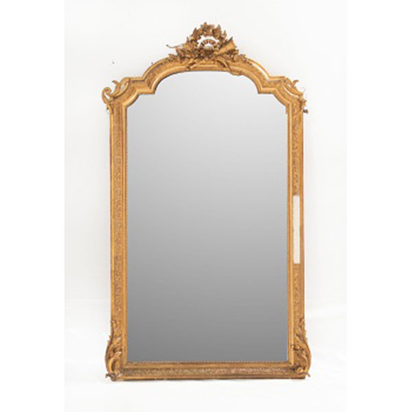 Espejo en madera y estuco dorado con decoración de vegetal, flores y perlas. Copete central representando corona de flores, lazos y antorchas. Luna biselada. Estilo Luis XVI. Época Napoleón III. Francia.