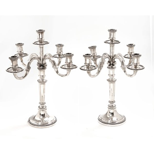 Pareja de candelabros de 5 brazos en plata con decoración de perlas. Estilo Luis XVI. Marcas del platero M. Espuñes.