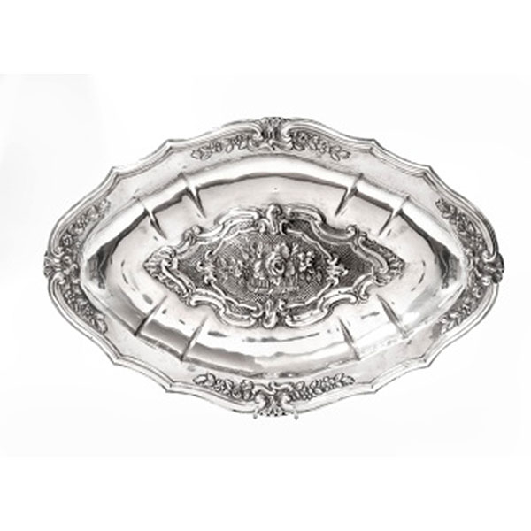 Bandeja de colgar en plata con decoración de flores, hojas y rocallas. Estilo Luis XVI. Marcas de platero. Cataluña.