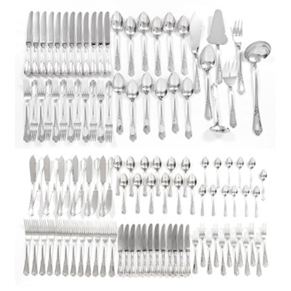 12 cucharas, 12 tenedores y 12 cuchillos de mesa, 12 tenedores y 12 palas de pescado, 12 cucharas, 12 tenedores y 12 cuchillos de postre , 12 cucharillas de moka, y 7 piezas de servir: cazo, cucharón, cazo de salsa, pala y tenedor de trinchar, tenedor de servir y pala de tarta .
