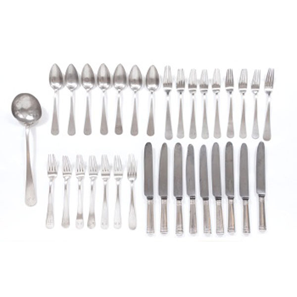 Cubertería en plata compuesta por 33 piezas: 7 cucharas de mesa, 16 tenedores de mesa y 9 cuchillos de mesa y cazo. Estilo Regencia. Marcas del platero Ampudia.