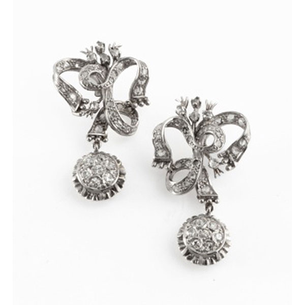 Pendientes largos en oro blanco en forma de lazo cuajado de diamantes y colgante con orla de 7 diamantes talla brillante cada uno con un peso total de 0,30 cts. aprox.