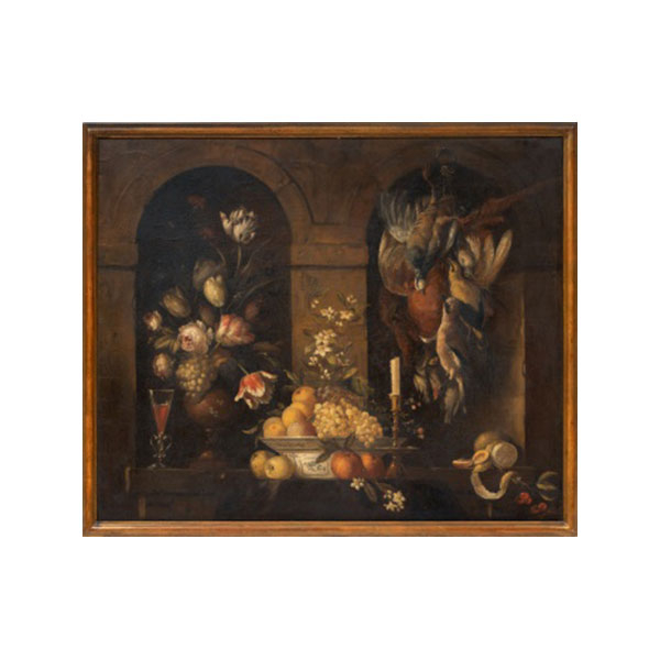 (Cervera , Lleida, Fin S. XIX - S. XX)"Bodegón de jarrón con flores , frutas y aves "Firmado: J. MartorellÓleo / Lienzo