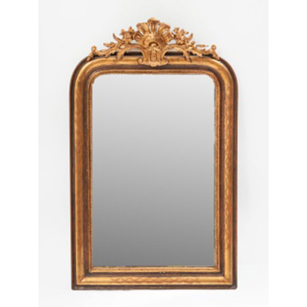 Espejo en madera tallada, dorada y estuco con decoración de perlas y copete central representando rocallas, flores y hojas. Estilo Luis XVI.