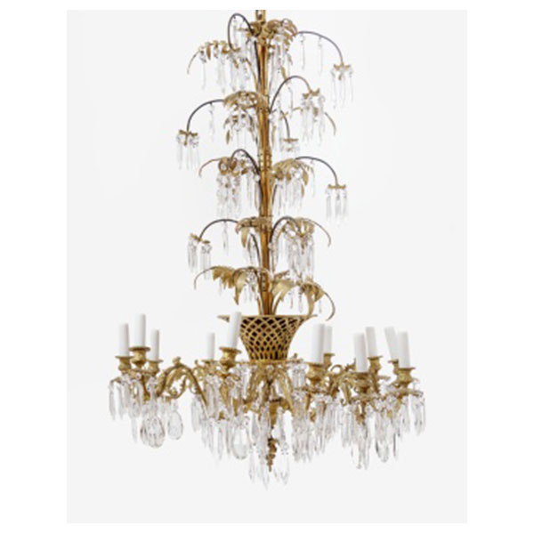 Lámpara de techo de 12 brazos y 3 luces en bronce dorado representando cesta con planta central, decoración vegetal y lágrimas de cristal. Estilo Luis XVI.