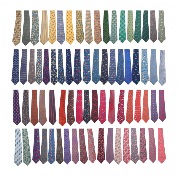 HERMÈS. Colección formada por setenta y tres corbatas Hermès en seda procedentes de la colección particular del presentador Joaquín Prat (Valencia, 1927-Madrid, 1995). Compuesta por una amplia selección de corbatas de la firma en diferentes tonalidades, formas y estampados.