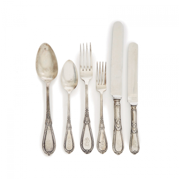 Compuesta por doce tenedores de mesa, doce cuchillos de mesa, doce cucharas soperas, doce tenedores de lunch, doce cuchillos de lunch y doce cucharas de lunch. Presenta falta un mango de cuchillo.