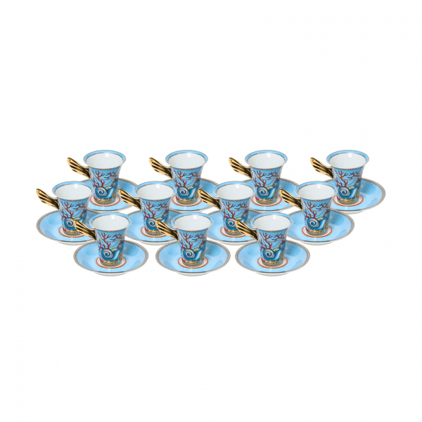 VERSACE. Juego de once tazas con platito modelo «Les Tresors de la Mer» en porcelana de Rosenthal (Alemania, 1879) esmaltada con motivos marinos de tonalidades azules y al oro fino.