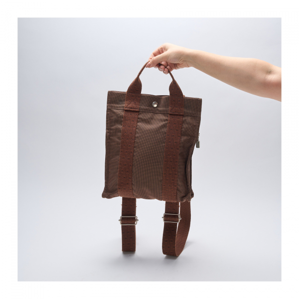 HERMÈS. Mochila modelo «Herline» en lona de tonalidad marrón con asas y correas ajustables en su parte trasera con cierres a presión y cremallera. En perfecto estado.