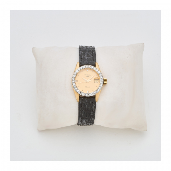 LONGINES. Reloj de pulsera para señora. En oro y correa de piel. Bisel con diamantes talla brillante.