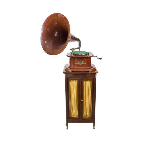 Se acompaña de mueble musiquero en madera con puertas batientes con cuatro departamentos en interior, ppios. del s.XX. Adjunta agujas de recambio, cepillo, cápsula de gramófono y llave del musiquero.
