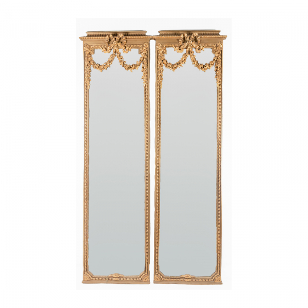Pareja de espejos «trumeau» estilo Luis XVI en madera tallada y dorada rematados en su parte superior por lazos y guirnaldas florales, s.XX.