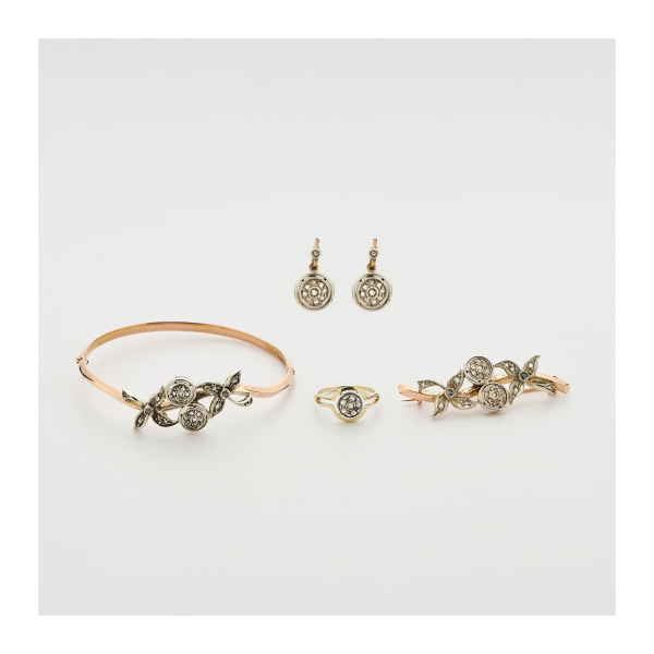 Juego de pulsera esclava, broche, pendientes y sortija estilo isabelino en oro 9K y vistas en plata con círculos y flores de diamantes talla rosa.