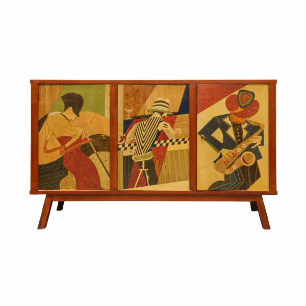 Aparador estilo Mid Century en madera chapada de diferentes tonalidades formando escenas de músicos de Jazz, s.XX.