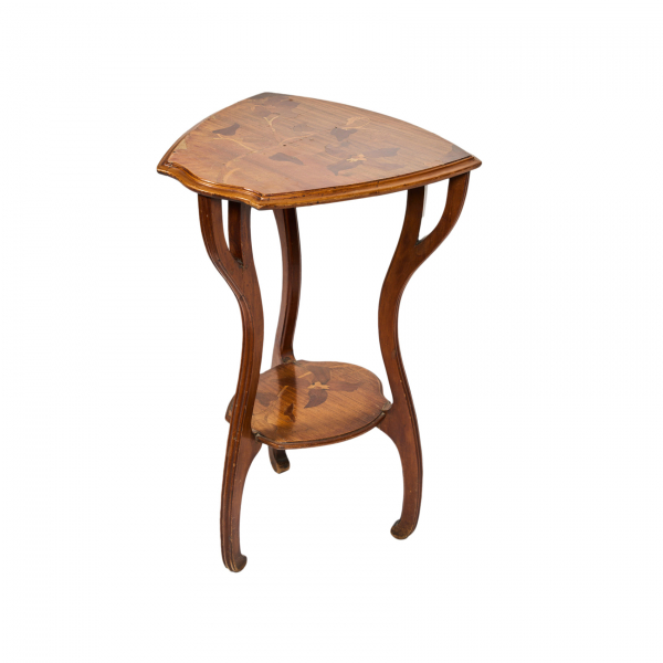 Mesa auxiliar Art Nouveau en madera de palorosa y cerezo con marqueterías en maderas frutales formando motivos florales.