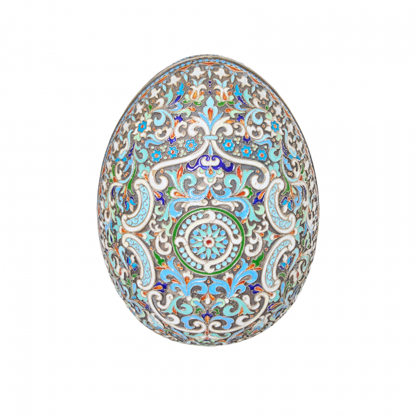 Decorado con diversos esmaltes cloisonné siguiendo las técnicas tradicionales rusas que Ovchinnikov introdujo en Rusia a finales del s.XIX. Presenta marcas al interior.