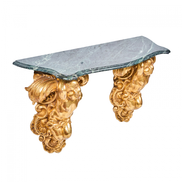 Consola de pared con sobre en mármol verde veteado de perfil sinuoso sustentado por pareja de ménsulas en madera tallada y dorada en forma de «puti» con rocallas, s.XX.