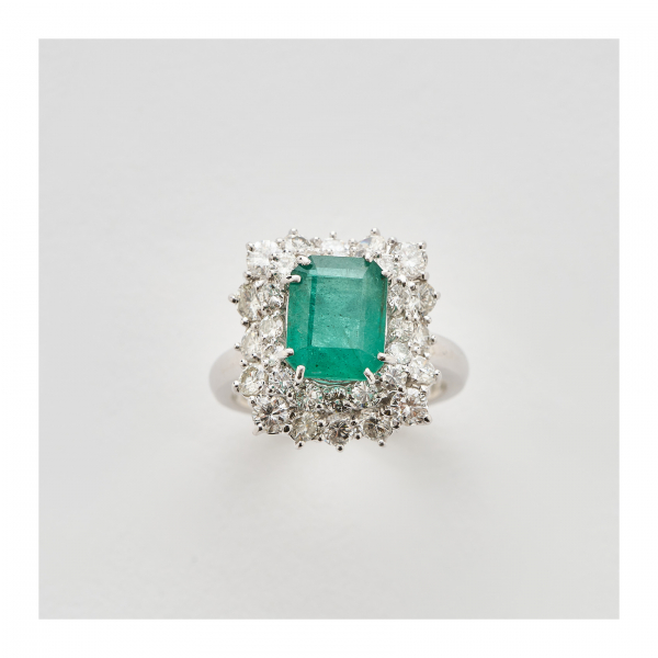Sortija rosetón en oro blanco con esmeralda talla octogonal y doble orla de diamantes talla brillante engastados en garras.