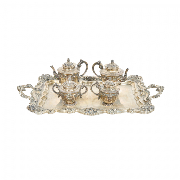 Compuesto por bandeja, tetera, cafetera, lechera y azucarera.