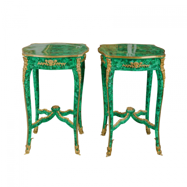 Pareja de mesillas estilo Luis XV realizadas en madera con aplicaciones en bronce y acabado en símil de malaquita, s.XX.