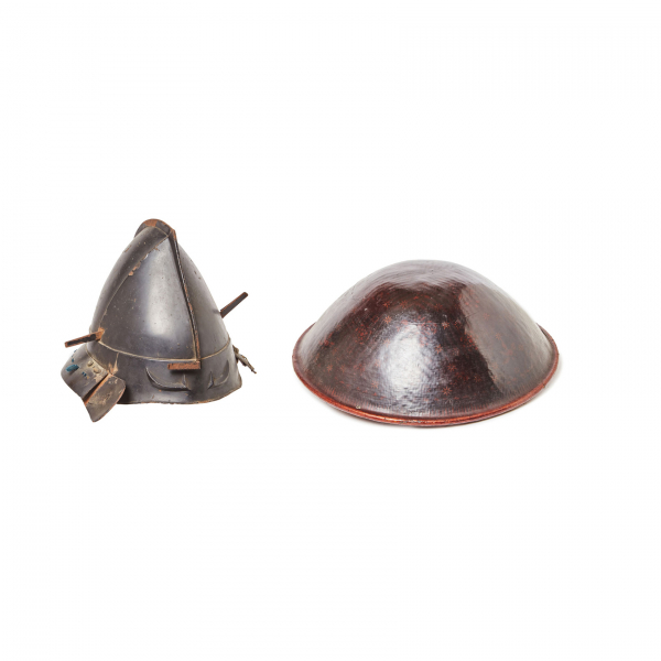 Lote formado por kabuto japonés en hierro lacado y sombrero cónico de fibra vegetal lacada con motivos decorativos procedente del sudeste asiático, s.XIX-XX.