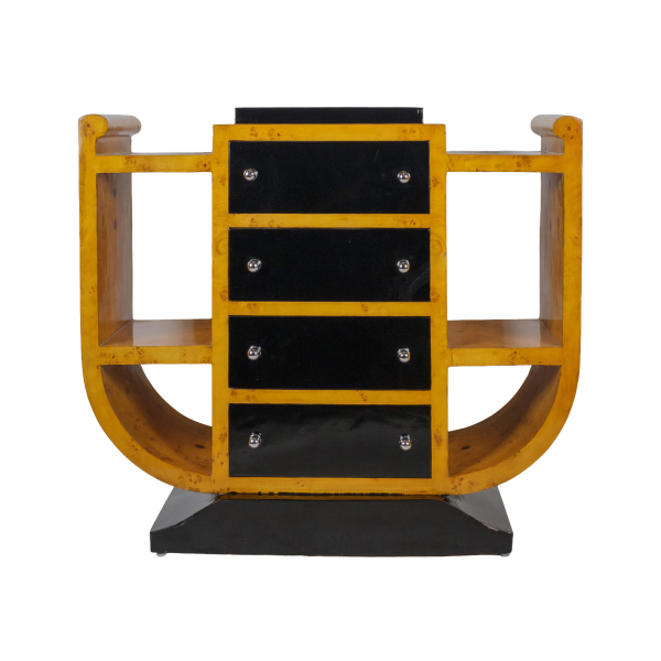 Cómoda estilo Art Deco en madera chapada con acabado en raíz de olmo y madera ebonizada, s.XX.