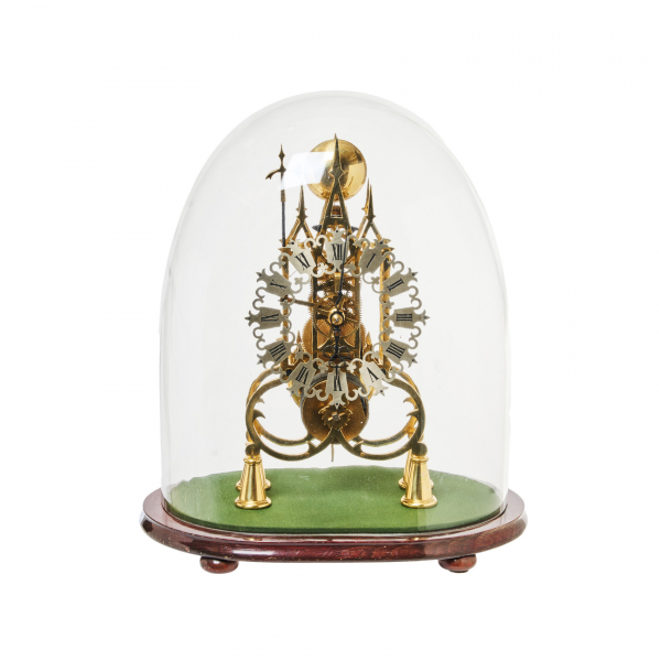 Esfera con numeración romana. Sonería de horas. Apoya sobre peana en madera y custodiado por urna en cristal. Adjunta péndulo y llave.