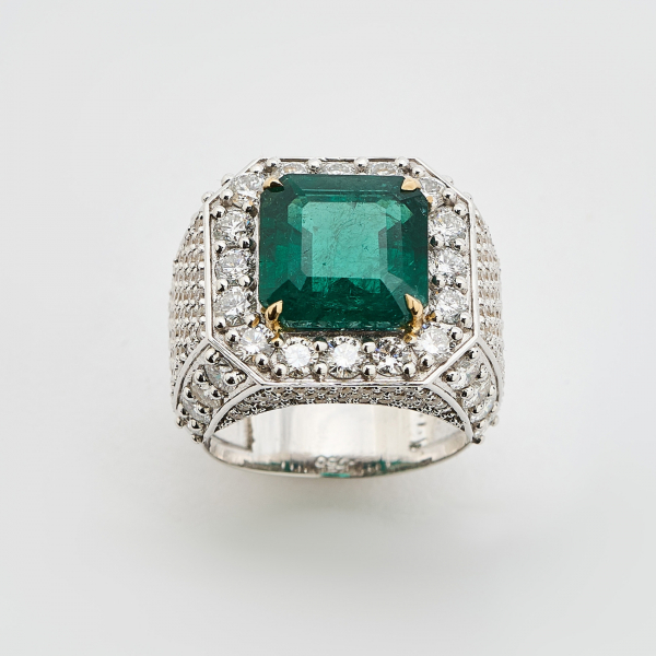Sortija diseño sello en oro bicolor con esmeralda central talla octogonal y cuerpo cuajado de diamantes talla brillante.