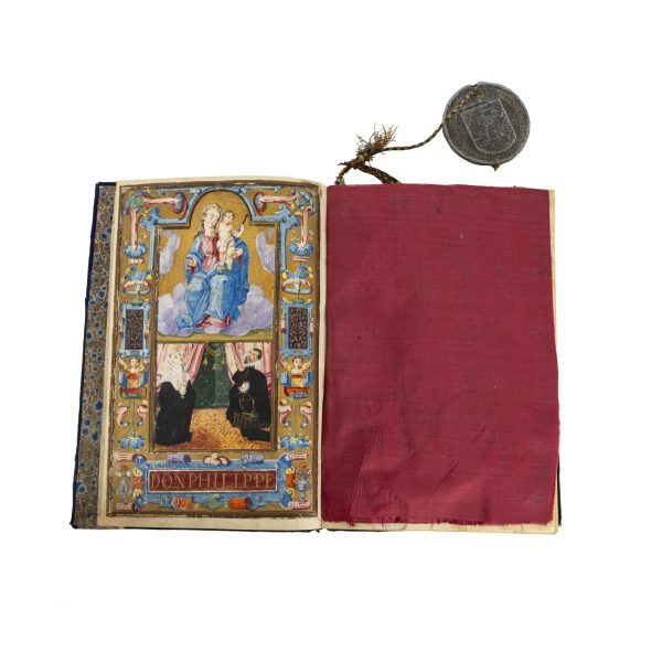 Carta ejecutoria rubricada en letra renacentista sobre pergamino. Iluminado con témperas y pan de oro pintadas a mano con representaciones de la Virgen y el Niño, Felipe II y escudo heráldico.